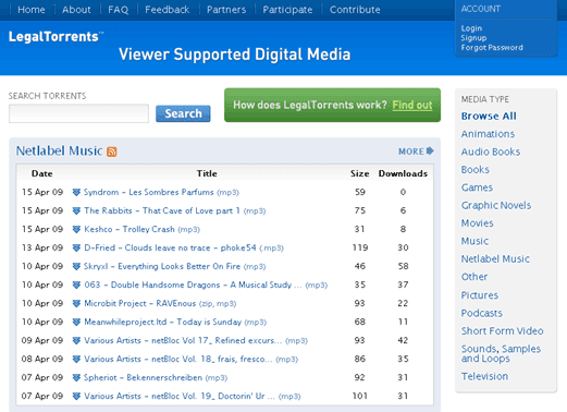 LegalTorrents 为可下载的专辑提供主机服务,这些专辑来自有好分享的创作者和整个的唱片公司 (网络唱片公司),他们免费提供作品目录。如果你喜欢你听到的,会鼓励你创建帐户来直接向这些作曲家和唱片公司捐助,或者这个完全自己制作 Torrents 种子的网站。
